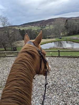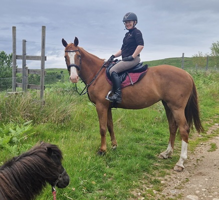 She does hack but prefers company as when by herself, the stones are out to get her! She has a great, fun personality and loves a cuddle.