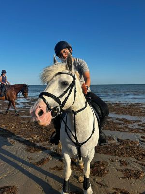 She hacks alone and in company. She can be stubborn at times when out hacking alone but always works through it. The beach is her favourite place and she loves a splash in the water.