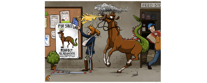 But on reflection, and after that glass of wine, you realise you’re being a bit harsh on poor old Prince. Also, there’s no way a dragon-mule hybrid will sell if you advertise it as a ‘good all-rounder.’ So instead you decide to focus on his good points instead – his brilliant jumping skills, the fact he can live out all year round, his loving nature.